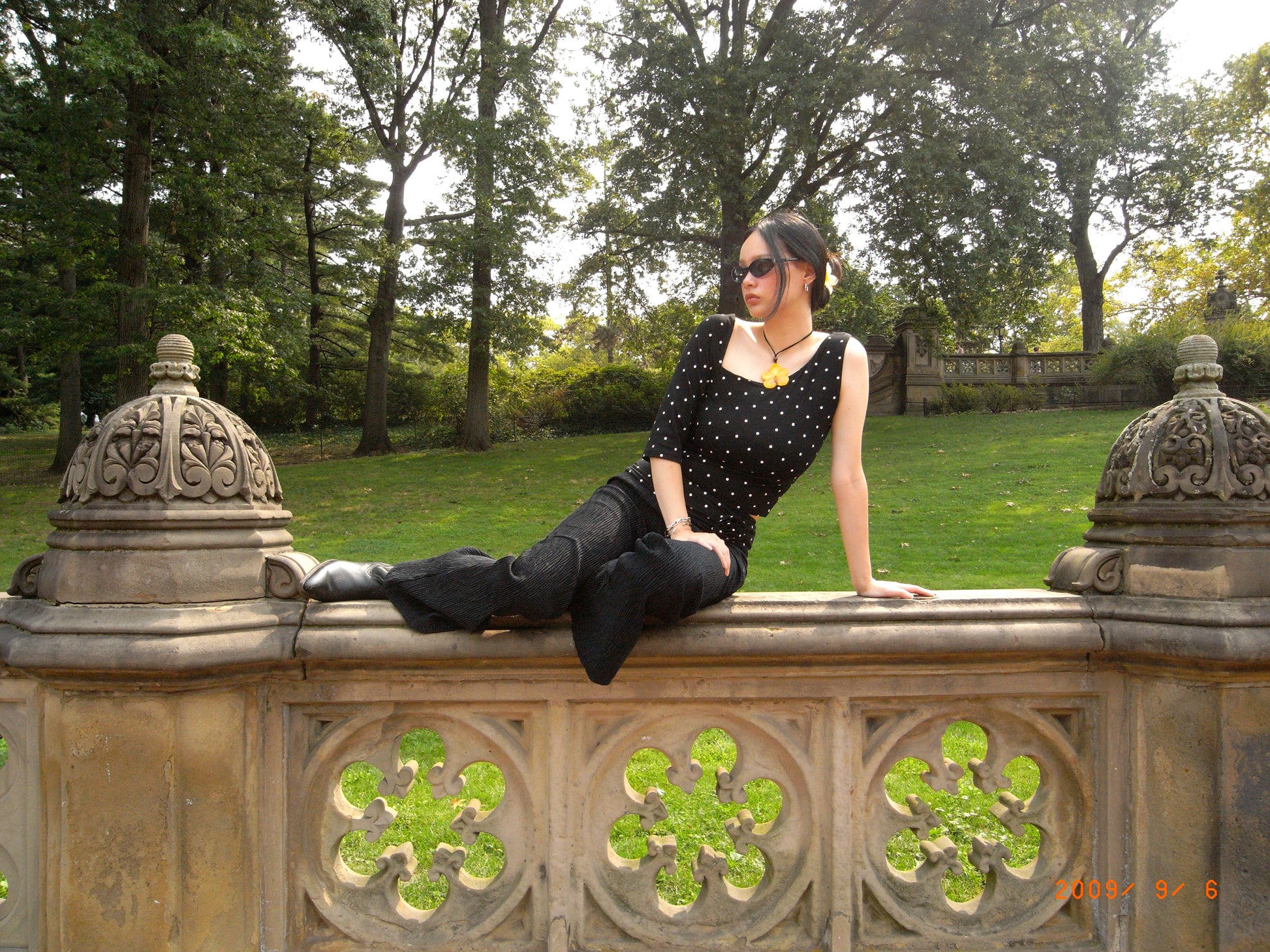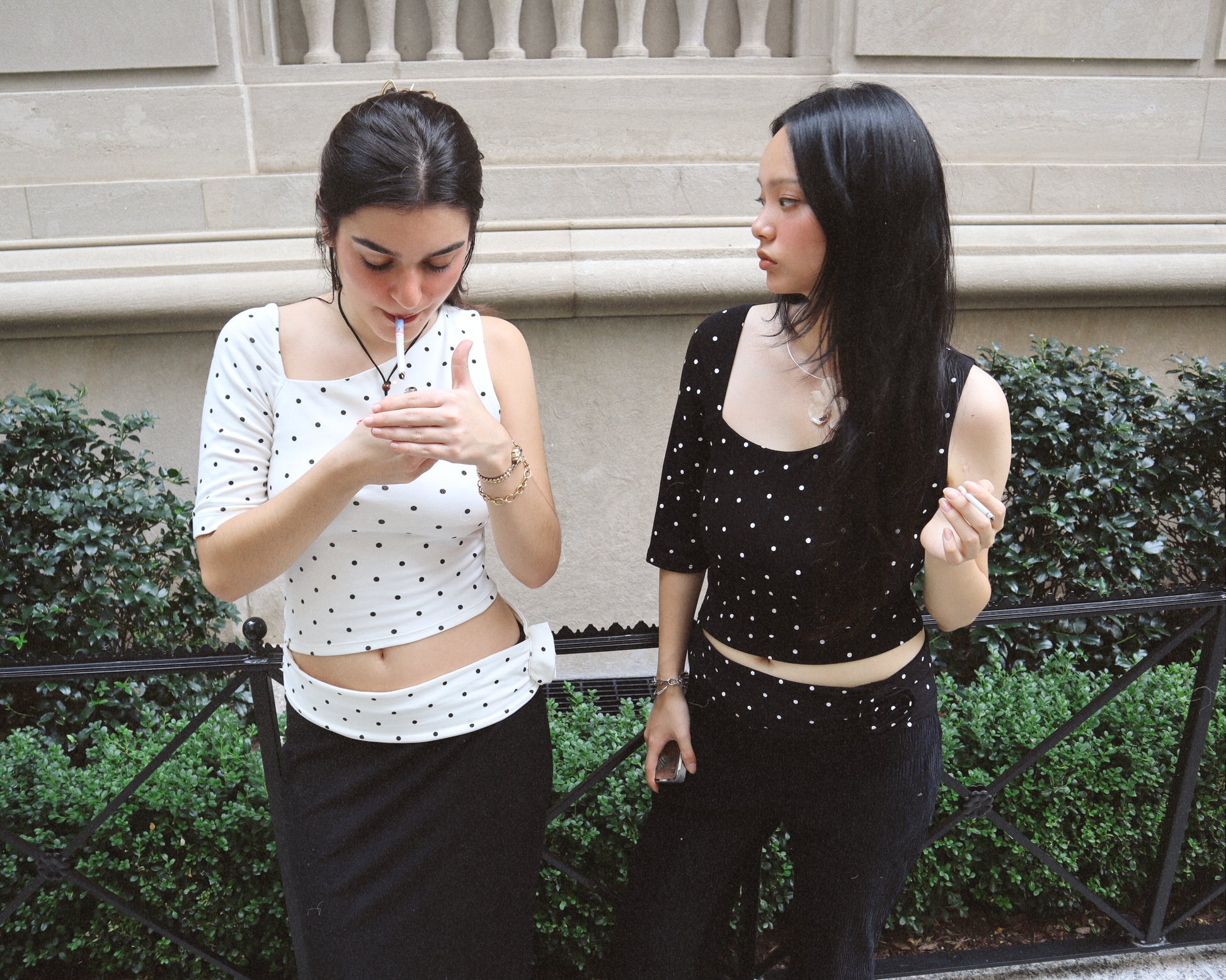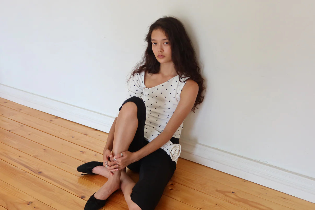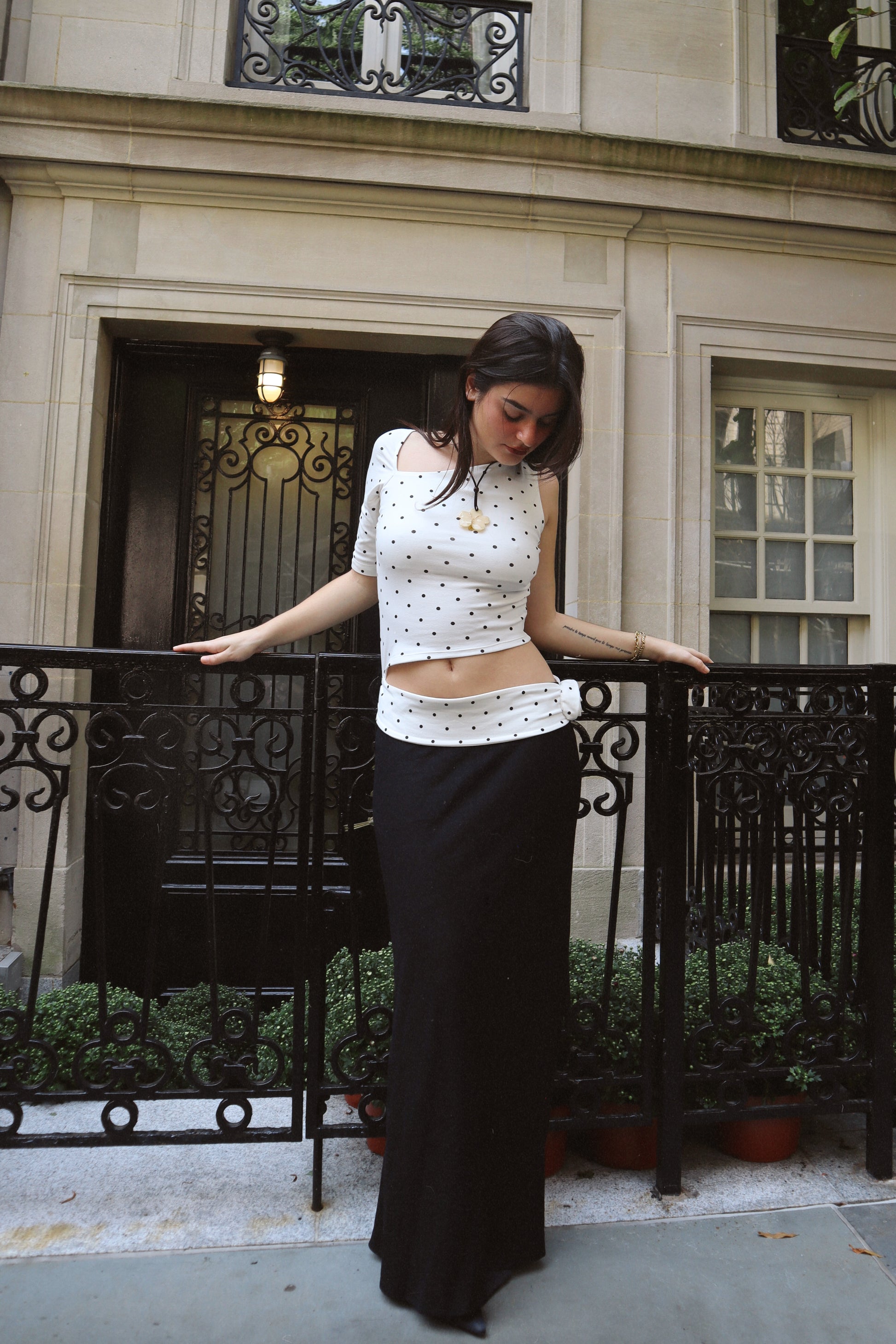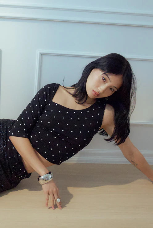 White stretch top with black polka dots and asymmetric one-shoulder neckline. Three-quarter sleeve with draped side tie at hip.