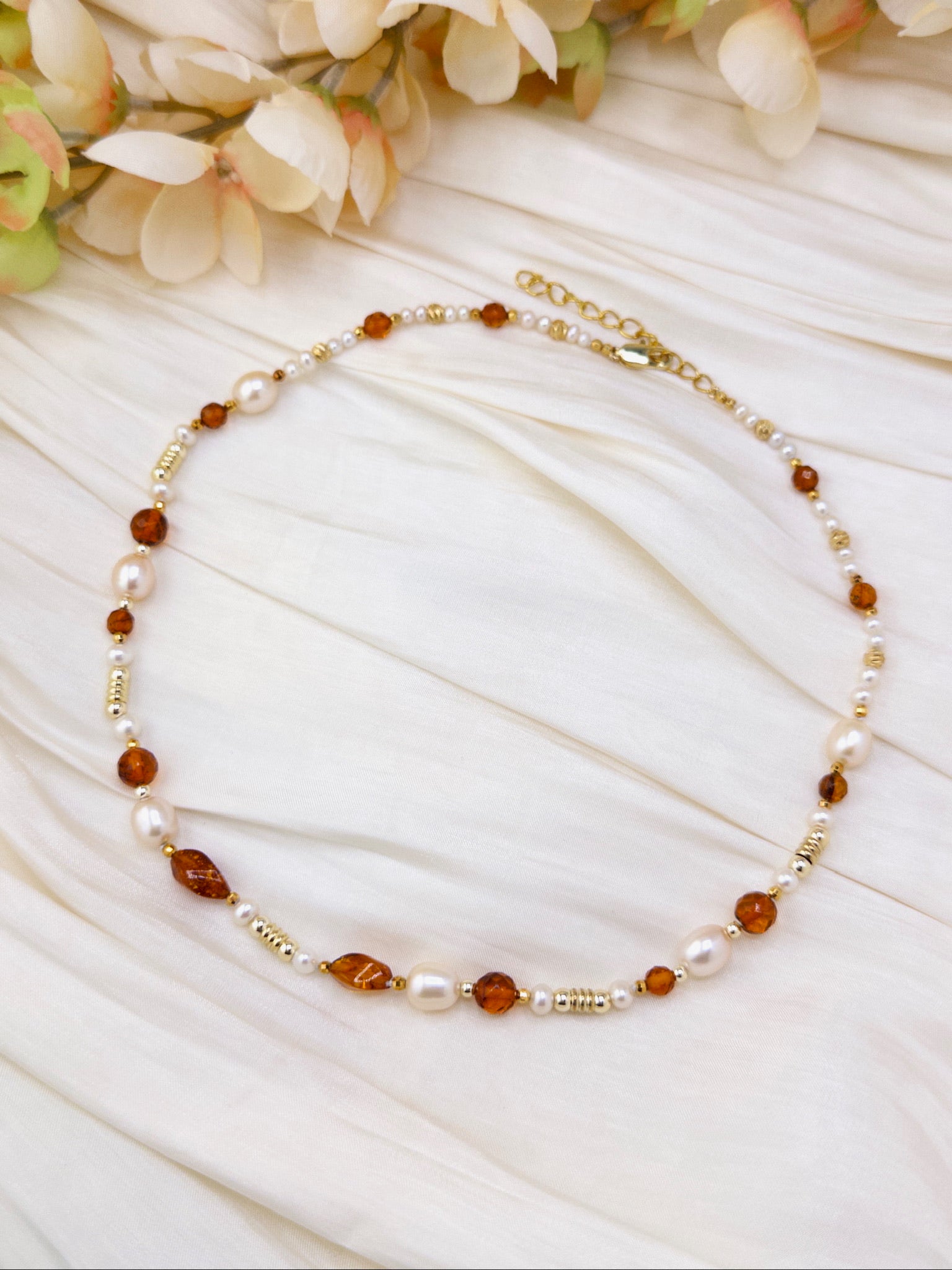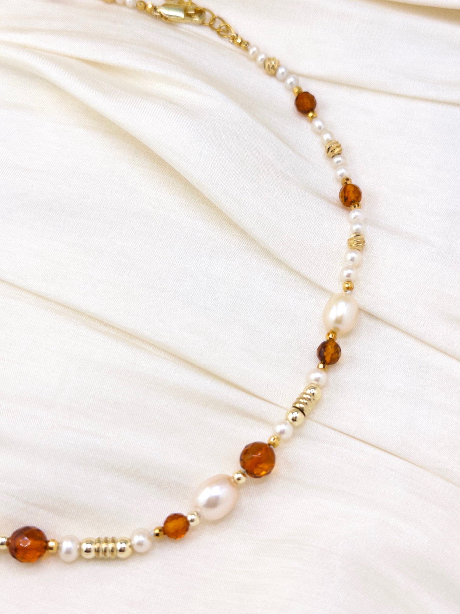 Freshwater pearl necklace with 14 amber accents. 3.00–7.90 mm pearls with 18K gold-plated stainless steel and brass clasp.