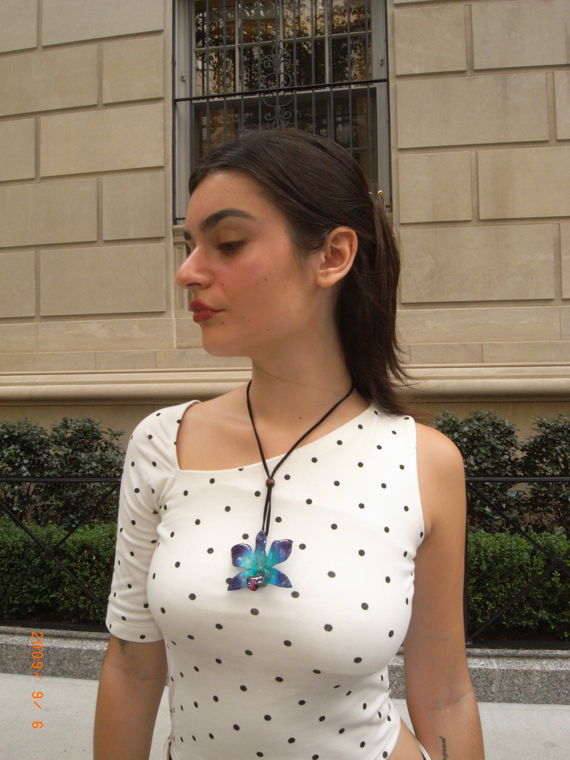 Suede cord necklace with real 6 cm blue Dendrobium orchid pendant and matching petal earrings. Adjustable suede tie and sterling silver hooks.