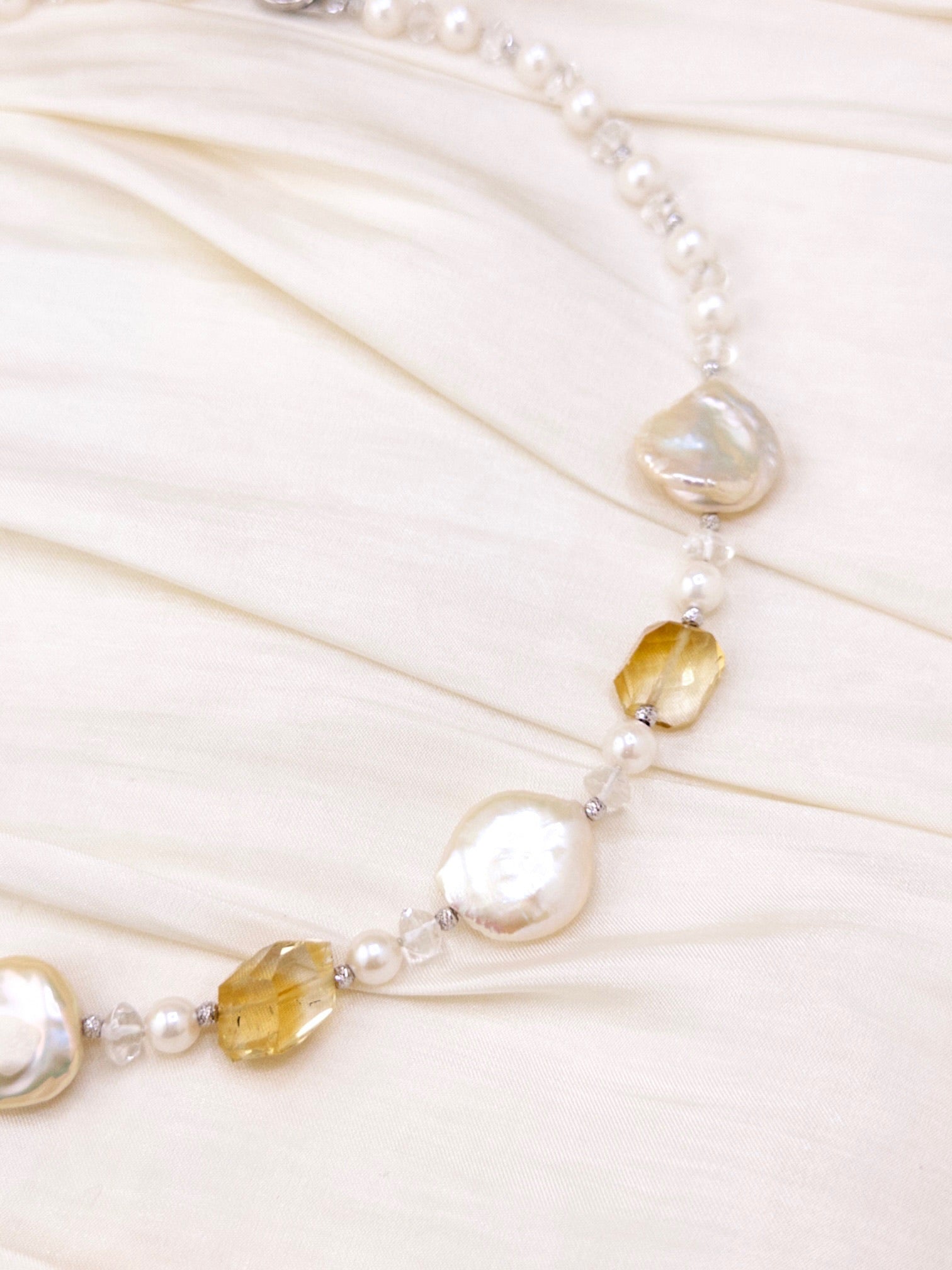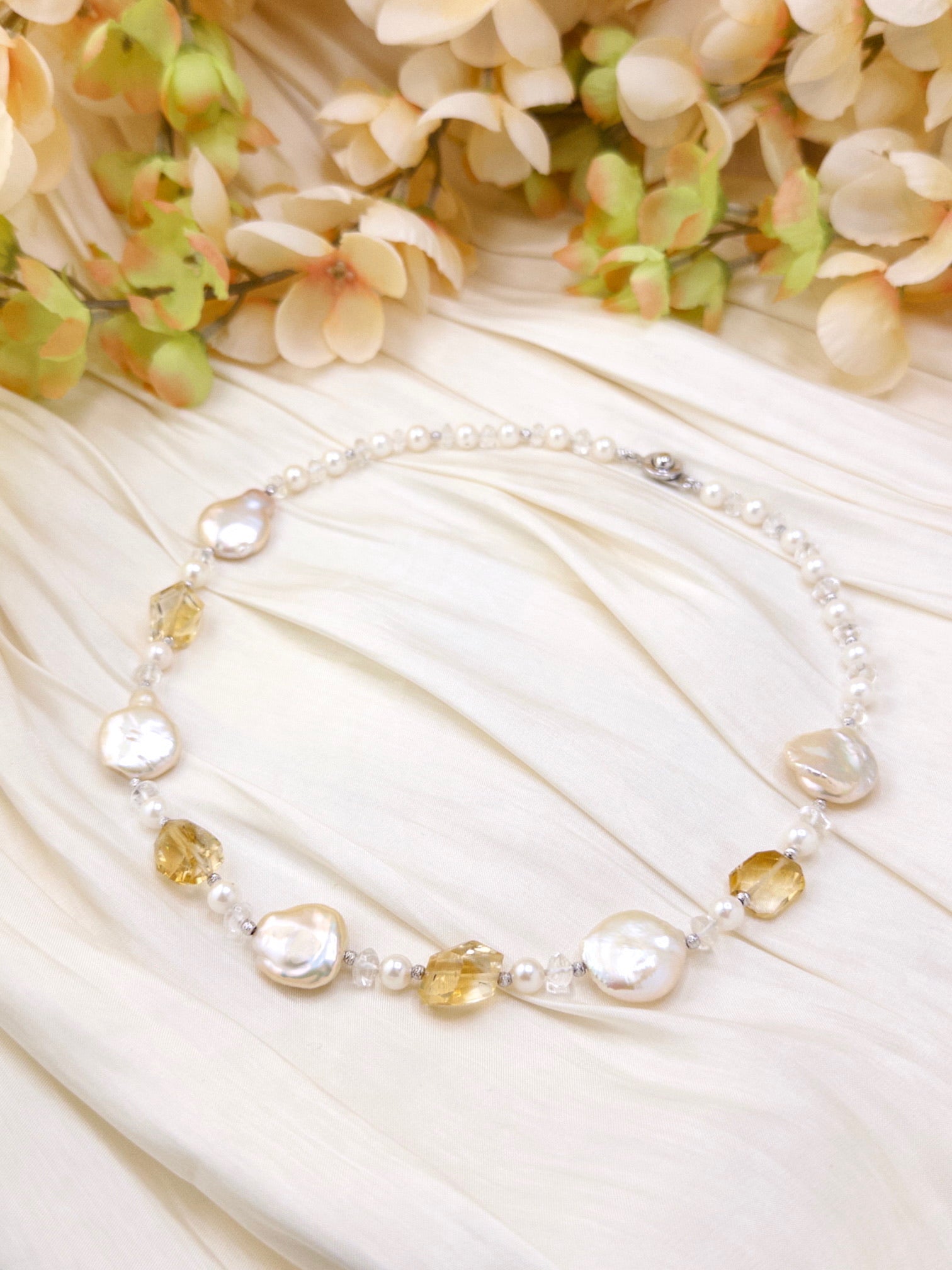 Freshwater baroque pearl necklace with 53 pearls and orange amethyst accents. 4.30–5.80 mm pearls with sterling silver clasp and bead accents.
