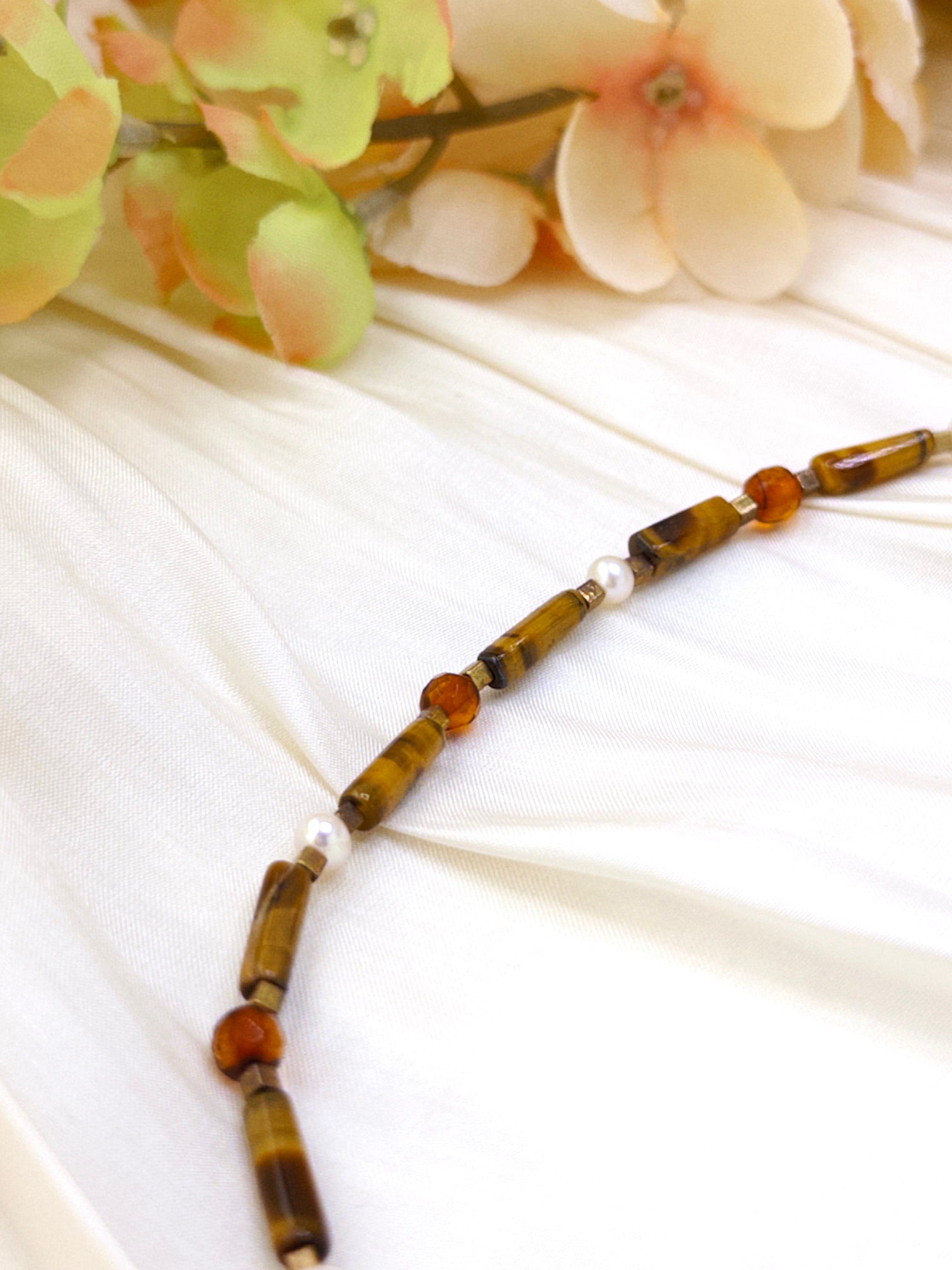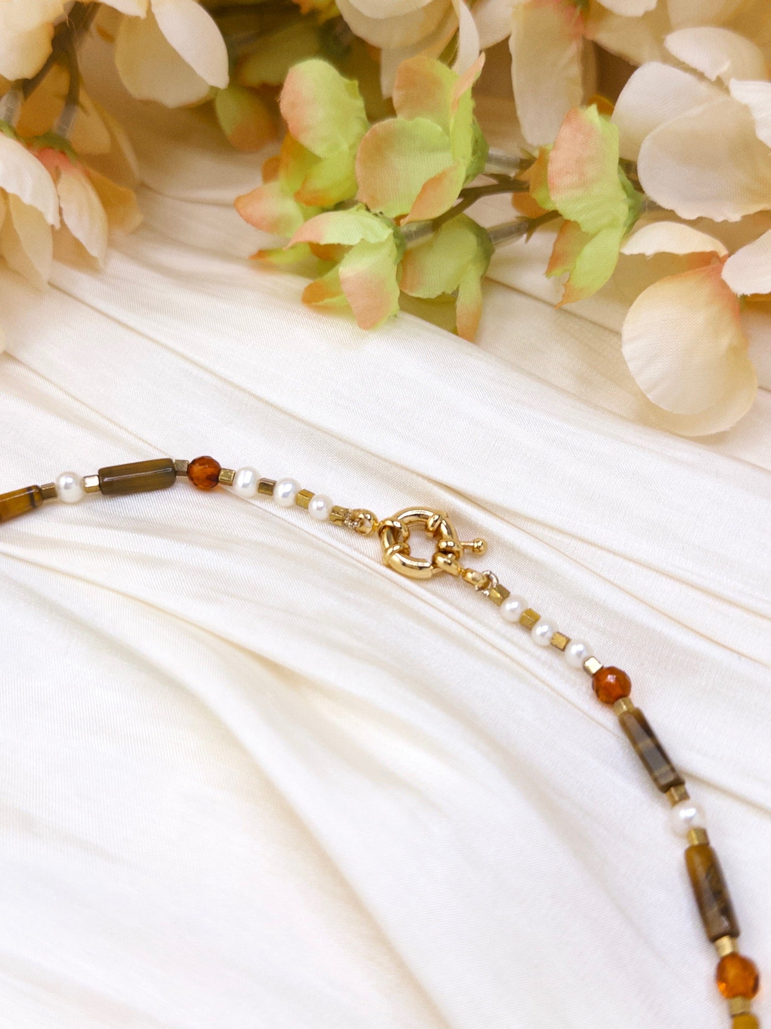 Freshwater pearl necklace with tiger eye and amber accents. 3.80–8.70 mm pearls with 18K gold-plated stainless steel and brass clasp.