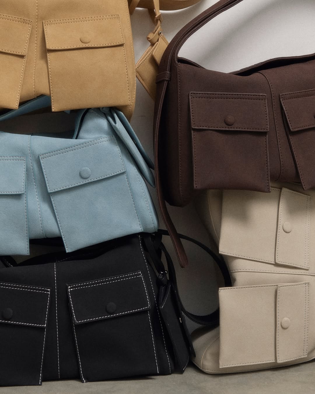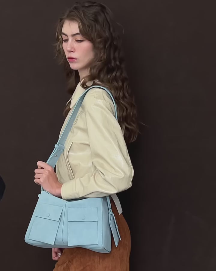 PU suede handbag, 28 × 11 × 18 cm (≈ 11.0 × 4.3 × 7.1 in). Fits phone, wallet, and small essentials. Muted earth tones with tonal stitching, front flap pockets, wide shoulder strap, and a clean, slightly slouchy shape.