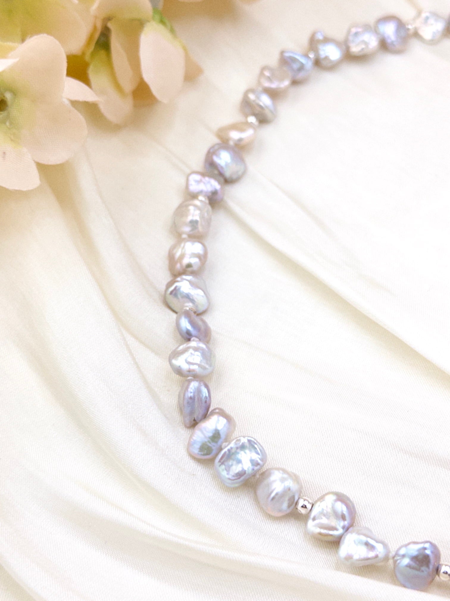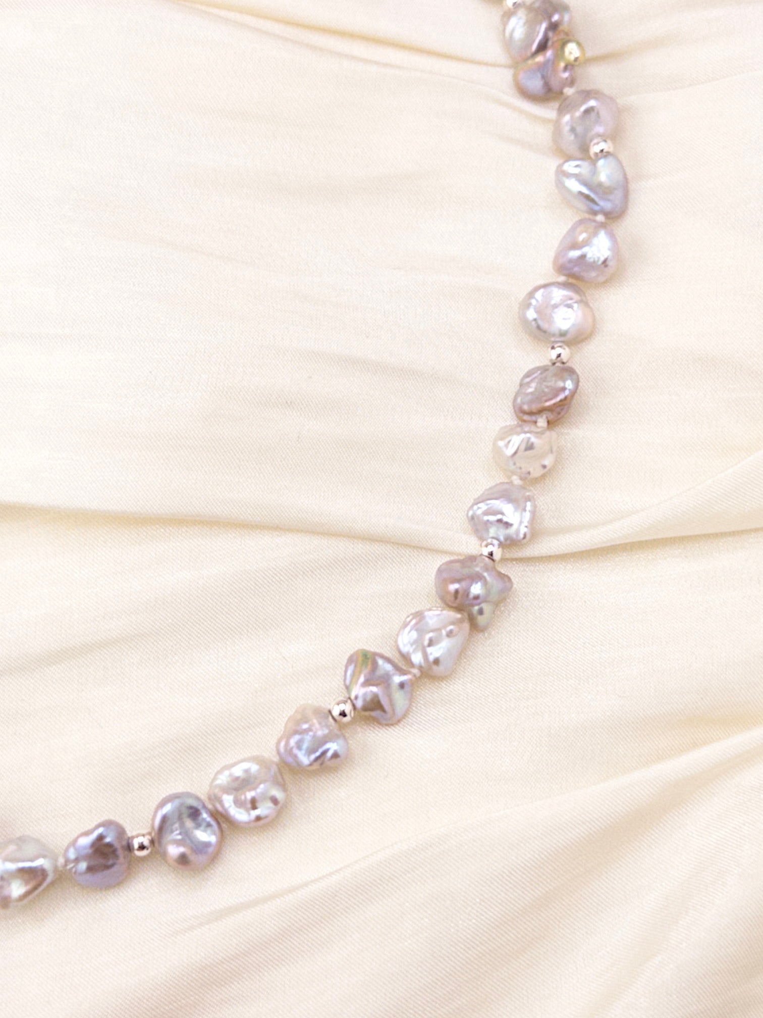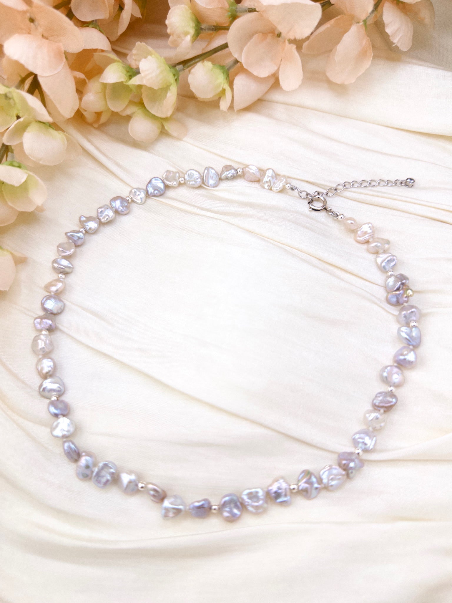 Multicolor Keshi pearl necklace with 48 pearls. 3.70–9.00 mm pearls with sterling silver chain and clasp.