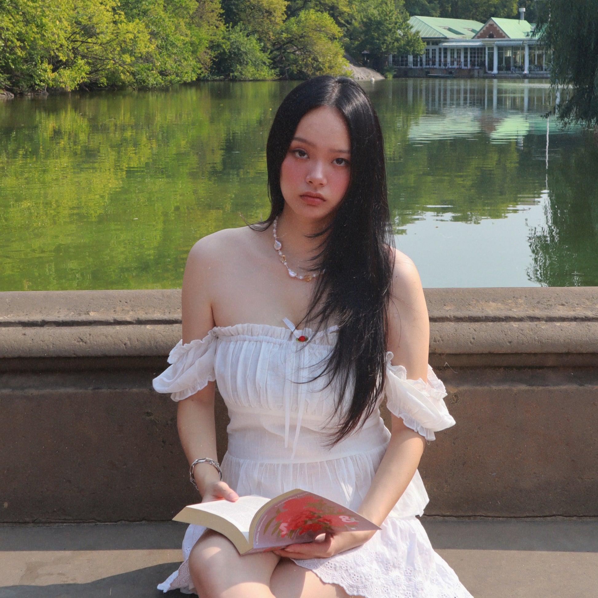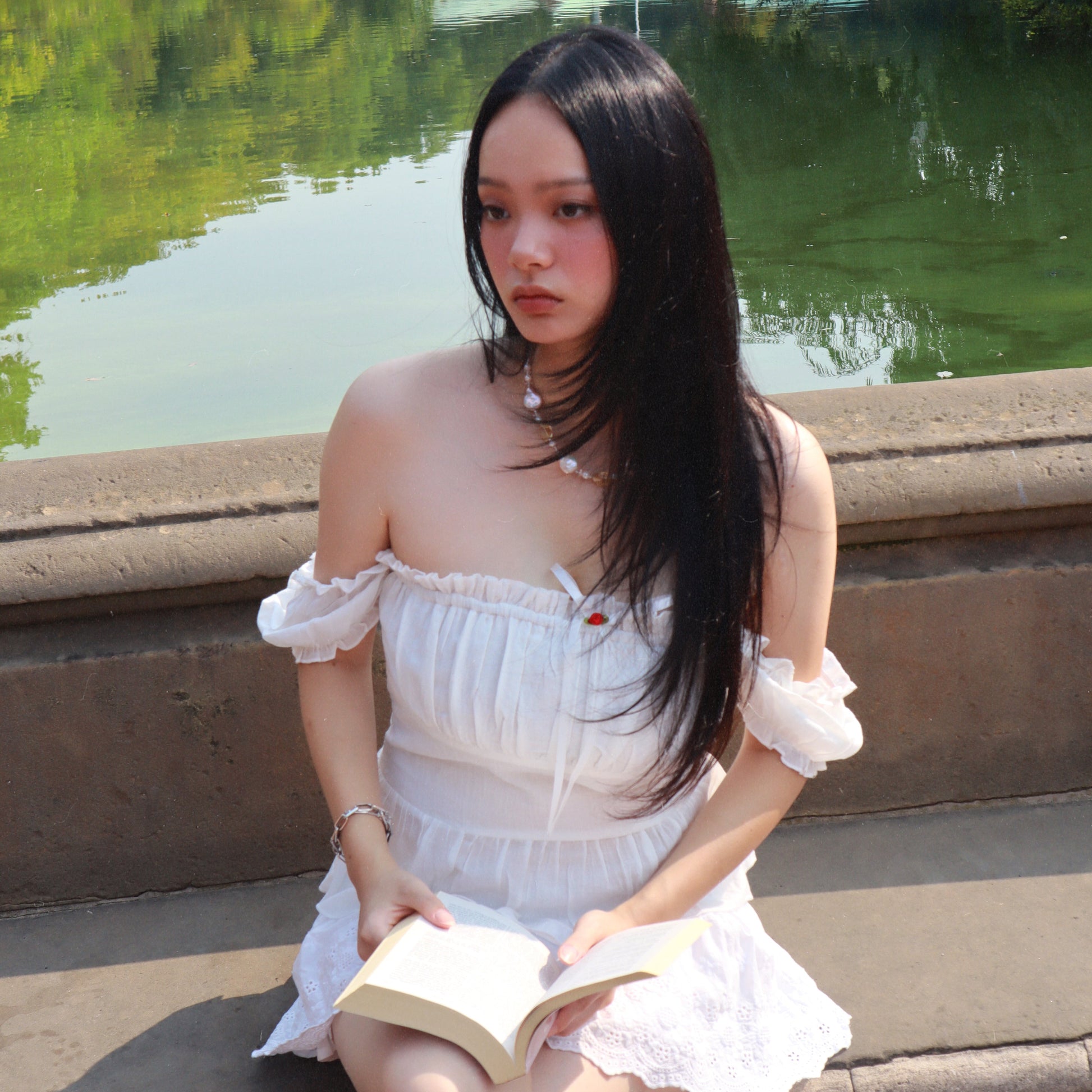 Cotton off-shoulder peplum top with puff sleeves. Chest bow with red rose embroidery.