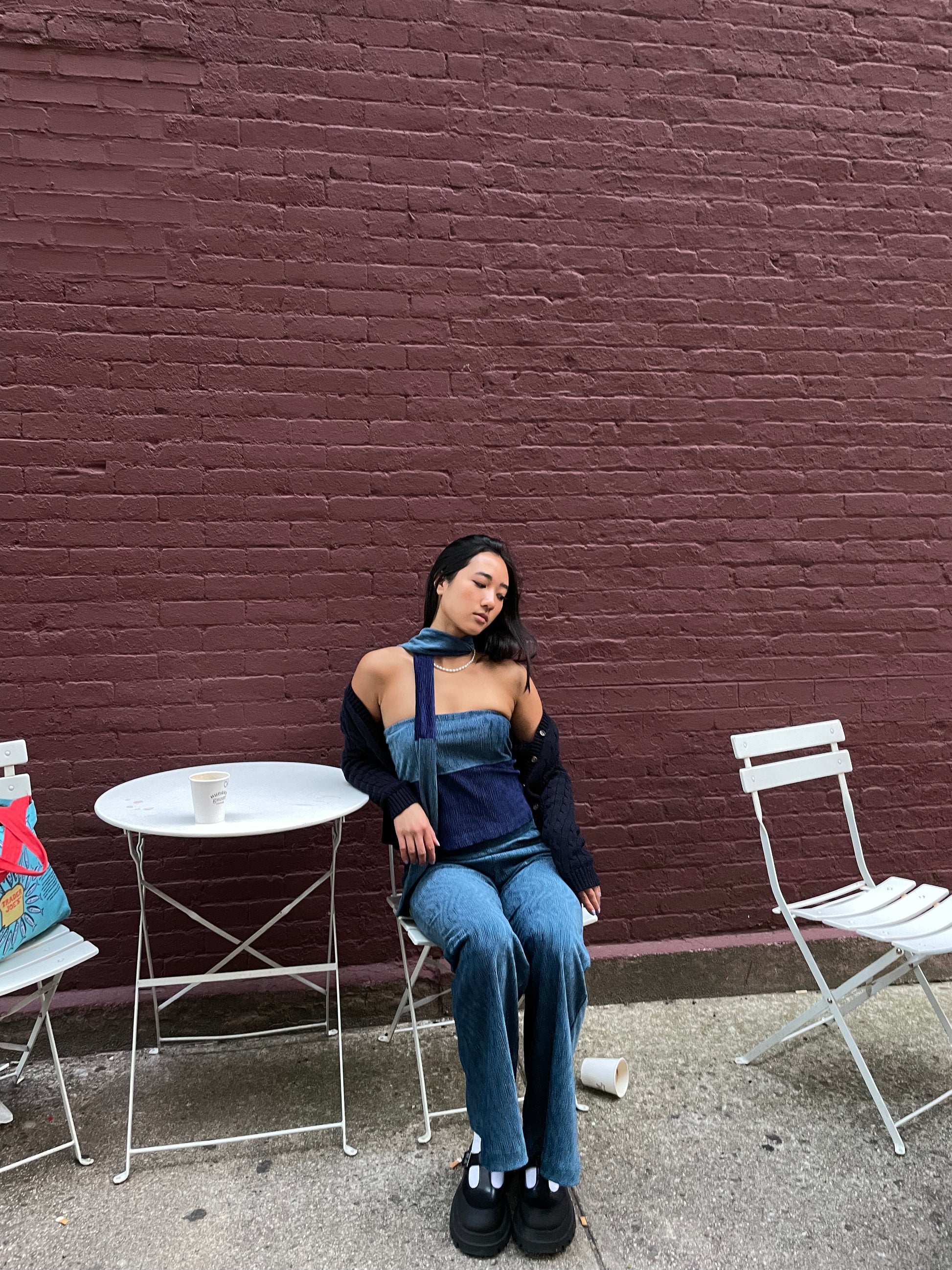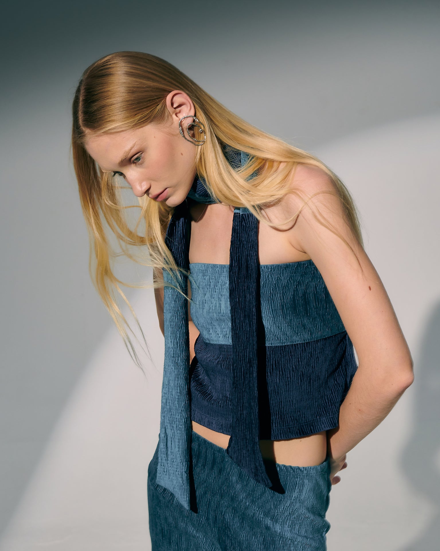 Velvet strapless tube top with subtle back slit. Matching scarf included; fully reversible front to back.