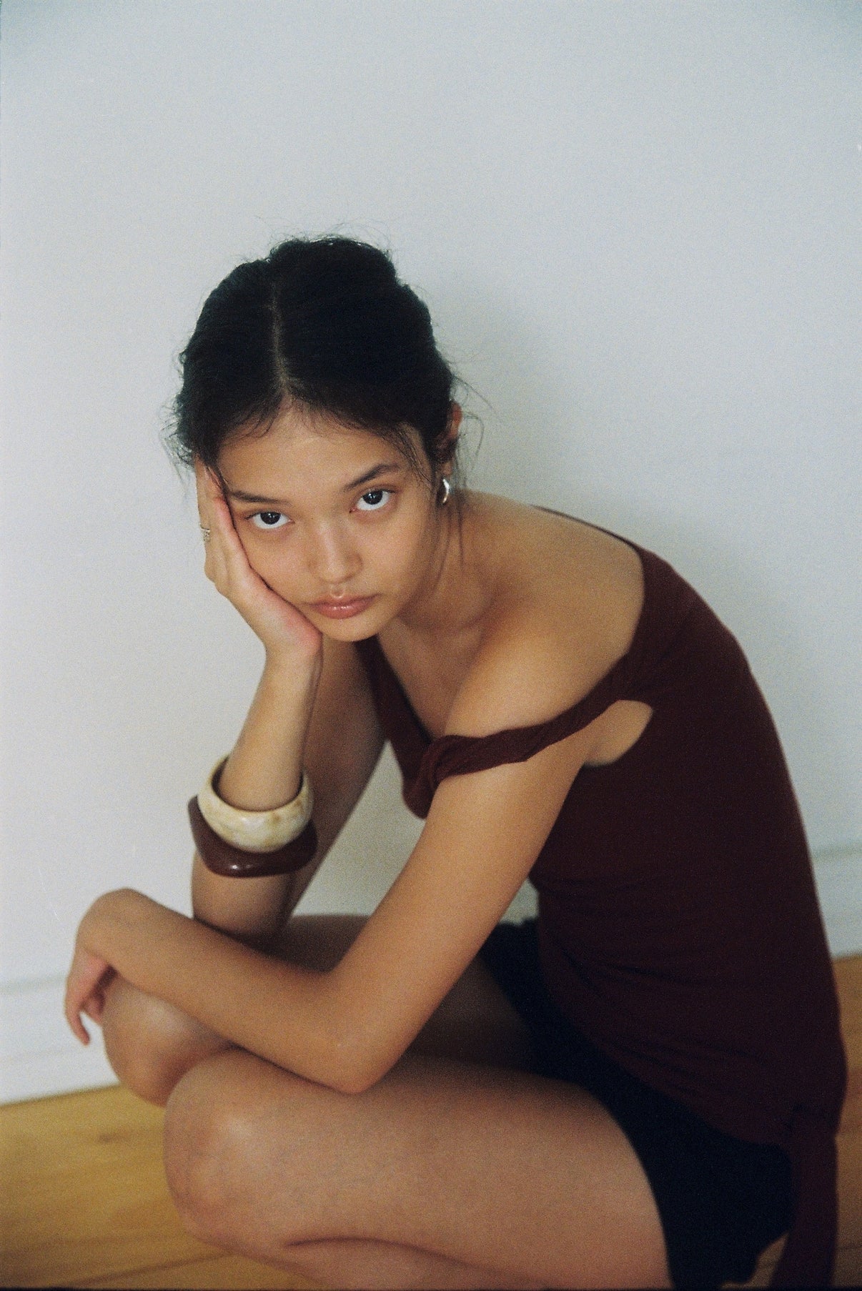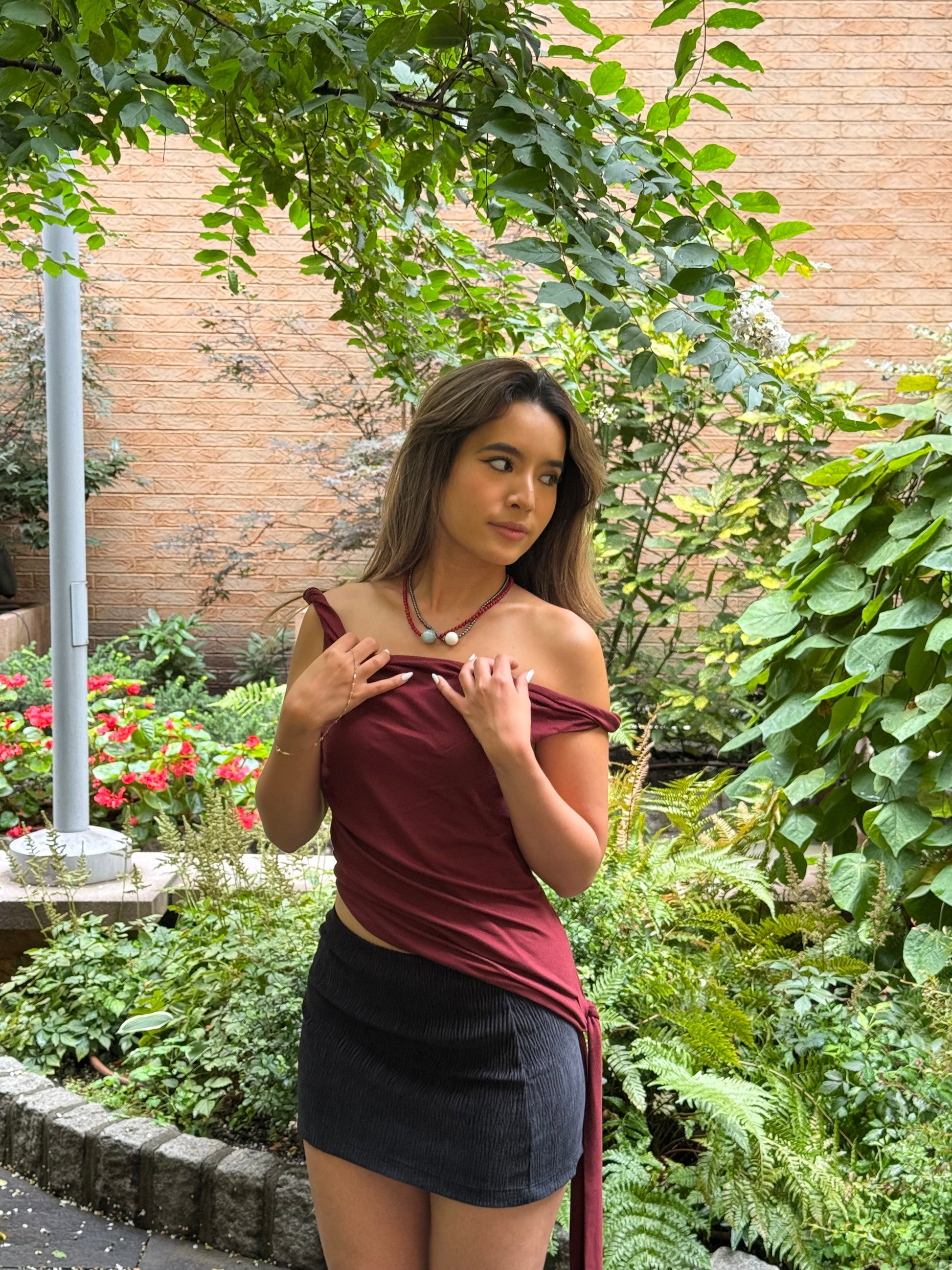 Red wine top with twisted straps styled multiple ways. Form-fitting design with angled hemline and ribbon tie accent.