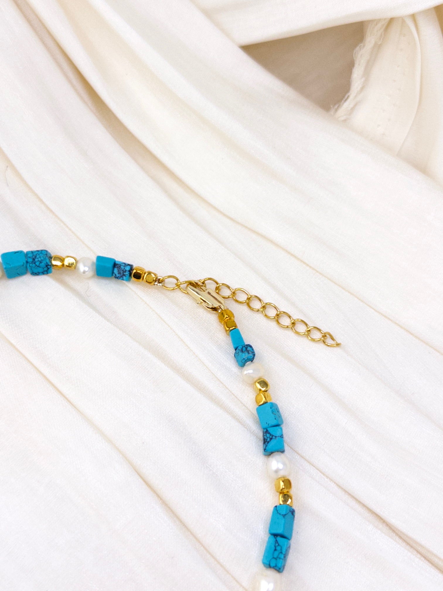 Turquoise necklace with freshwater pearl accents and gold-plated beads. 5.00–6.00 mm pearls with 18K gold-plated brass closure.