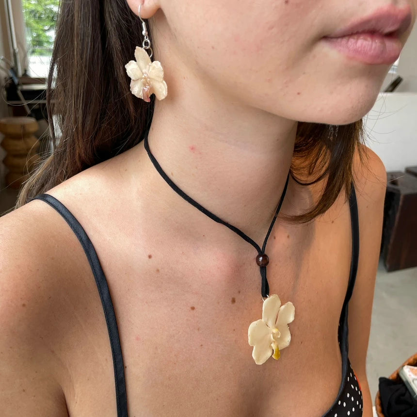 Suede cord necklace with real 5 cm white Vanda orchid pendant and matching orchid earrings. Adjustable suede tie and sterling silver hooks.