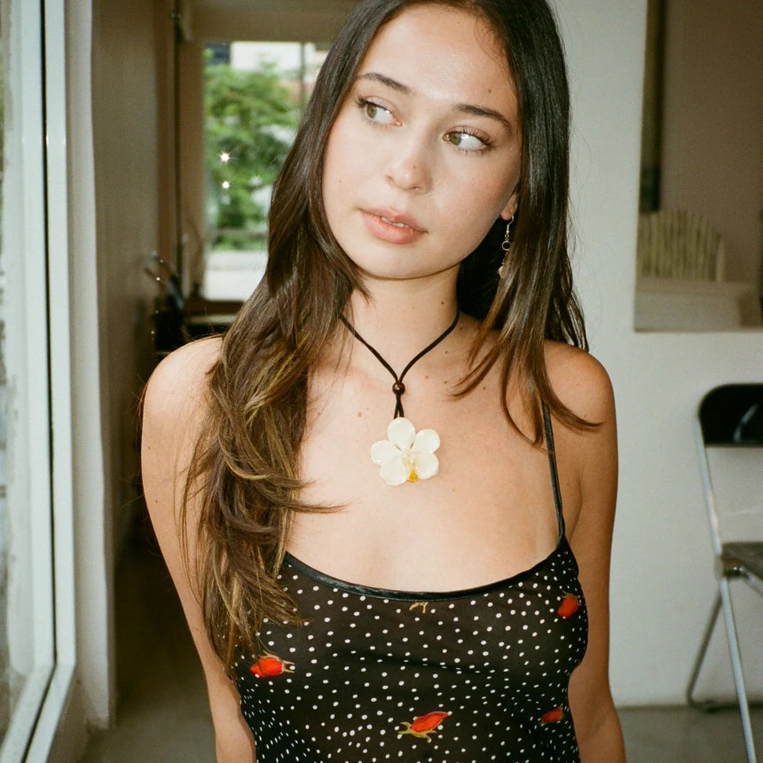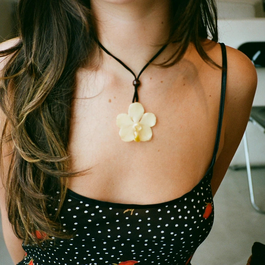 - 5CM white resin-coated Vanda orchid with adjustable suede tie